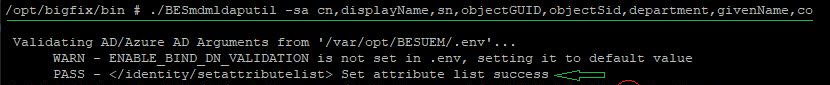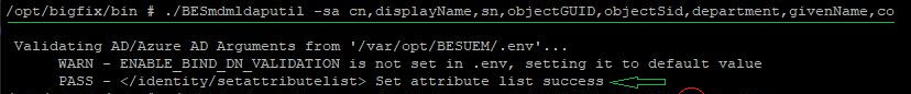 docker exec -it idservice /opt/bigfix/bin/BESmdmldaputil -sa attributeName1,attributeName2,attributeName3