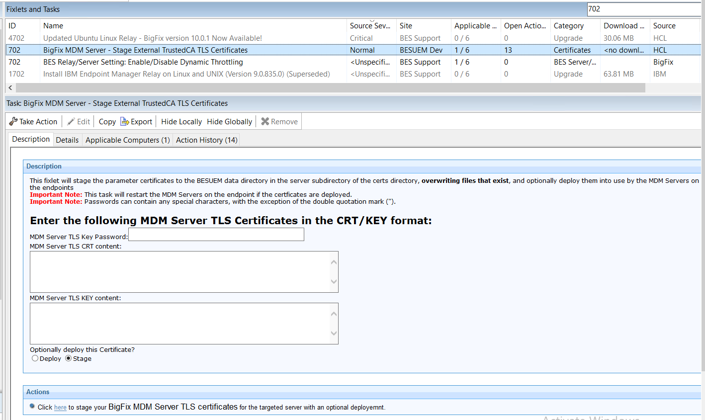 Fixlet 702: BigFix MDM Server - Stage External TrustedCA TLS Certificatesを開きます。