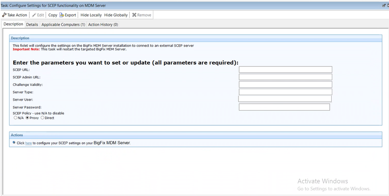 Note: SCEP ポリシー・タイプが「PROXY」または「DIRECT」の場合、Fixlet のデプロイに進むには、パラメーターすべての値を入力する必要があります。