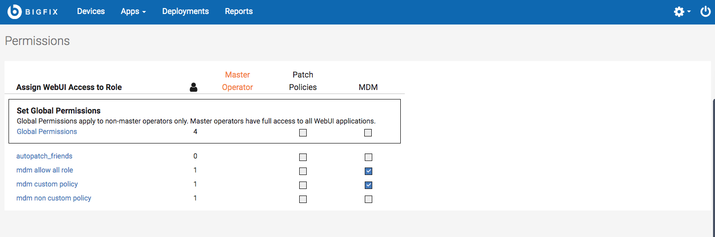 - 例えば、「mdm すべての役割の許可」と「mdm カスタム・ポリシー」の役割を持つユーザーは、MCM アプリケーションを表示できますが、これらの役割ではないユーザーは、MCM アプリケーションにアクセスできません。
