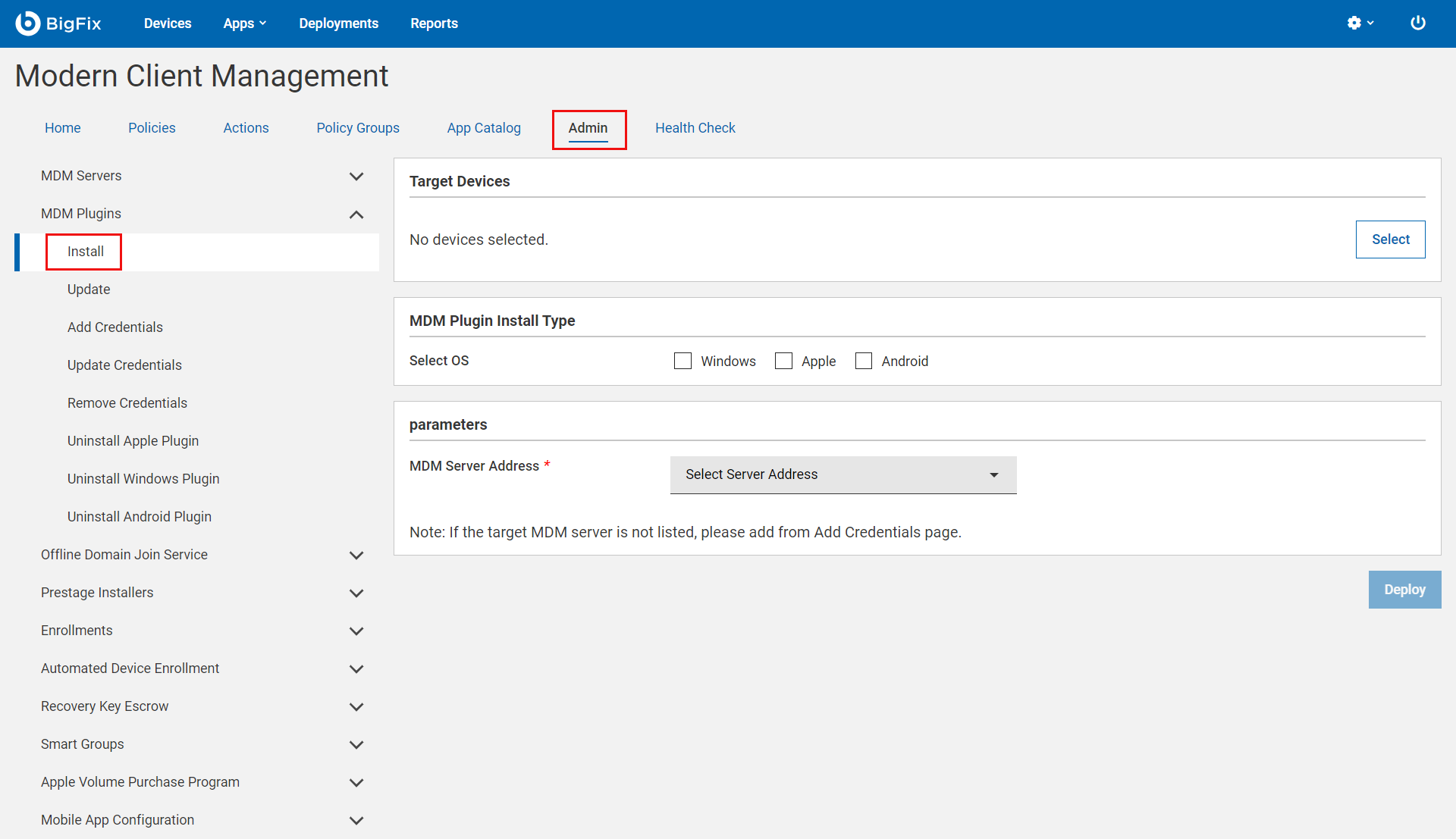 - 「対象デバイス」セクションで、「選択」をクリックし、MDM プラグインをインストールする Windows または Linux のプラグイン・ポータルを選択します。