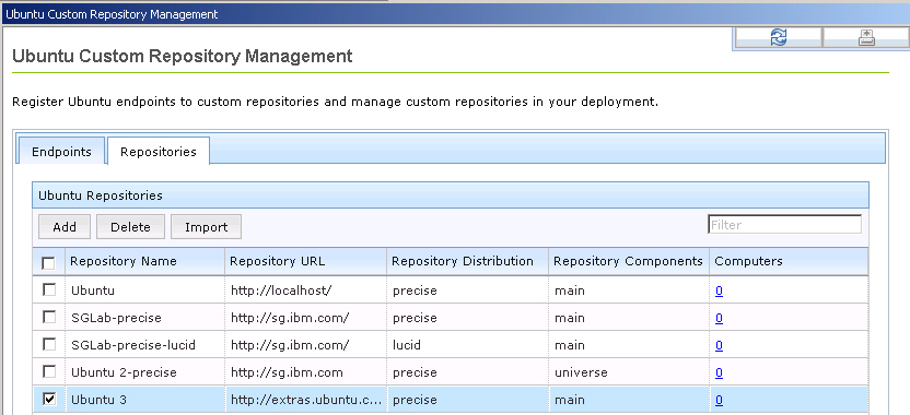 リポジトリーの削除 Ubuntu カスタム・リポジトリー管理ダッシュボードを使用して、リポジトリーを削除できます。 手順「すべてのコンテンツ」ドメインから、「サイト」 > 「外部サイト」 > 「パッチ・サポート」 > 「ダッシュボード」 > 「Ubuntu カスタム・リポジトリー管理 (Ubuntu Custom Repository Management)」に移動します。「リポジトリー」タブで、削除するリポジトリーを選択して「削除」をクリックします。 「はい」をクリックして、リポジトリーを削除します。 タスクの結果これでリポジトリーが削除されました。