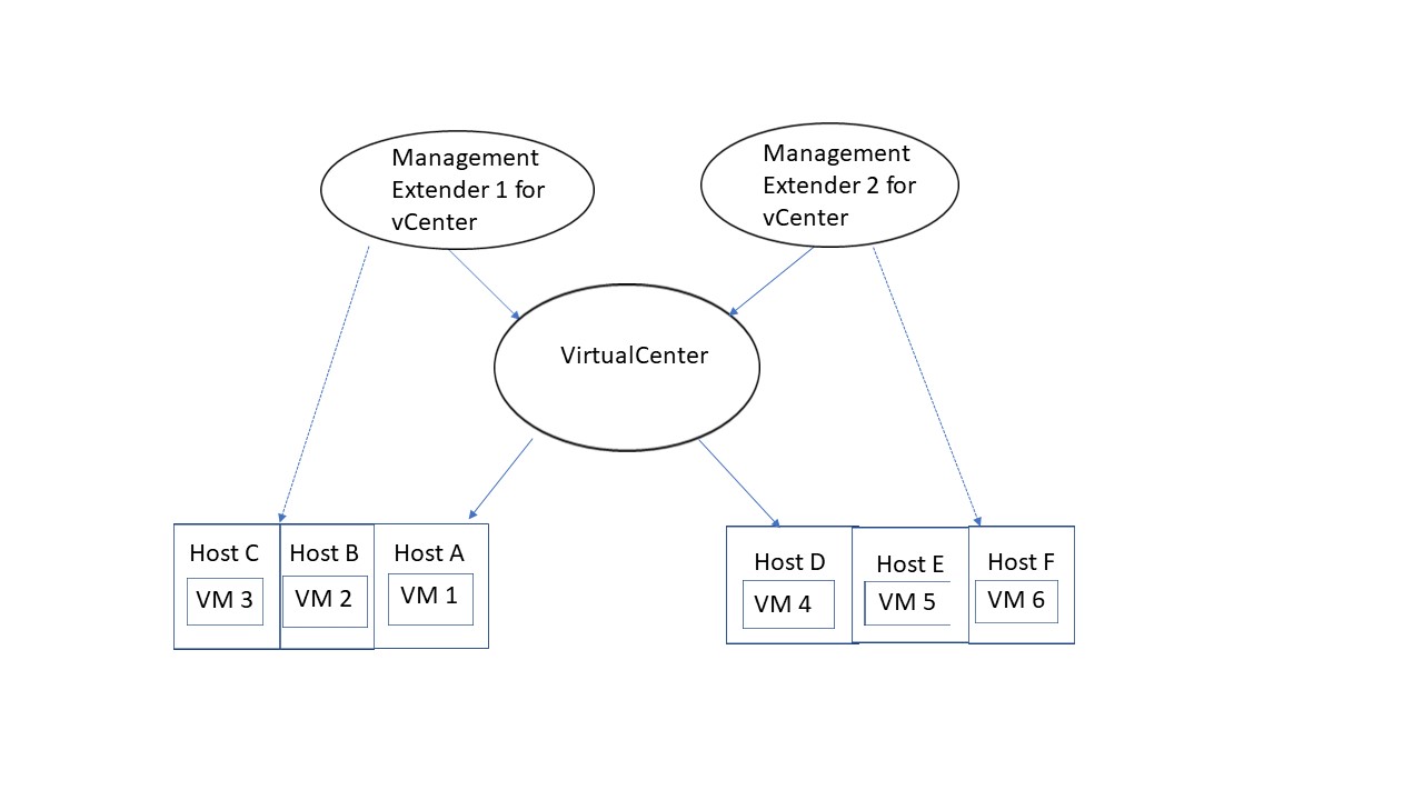 以下の図は、Virtual Endpoint Manager が大規模環境で動作してワークロードの均衡化を最適化するためにどのように設計されているかを視覚的に示したものです。これらの環境では、同じ Virtual Center が 2 つ以上の Management Extender によって管理されています。