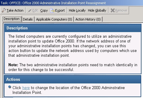- パッチが適用される Office 製品は、正しい管理インストール・ポイントを指していなければなりません。また、この管理ポイントは、パッチが適用される製品と一致していなければなりません。たとえば、Office 2000 Standard インストール済み環境が Office 2000 Professional 管理ポイントを指すことはできません。ナビゲーション・ツリーの「OS ベンダー」サイトをクリックし、次に、「Microsoft Office」および「設定」をクリックします。