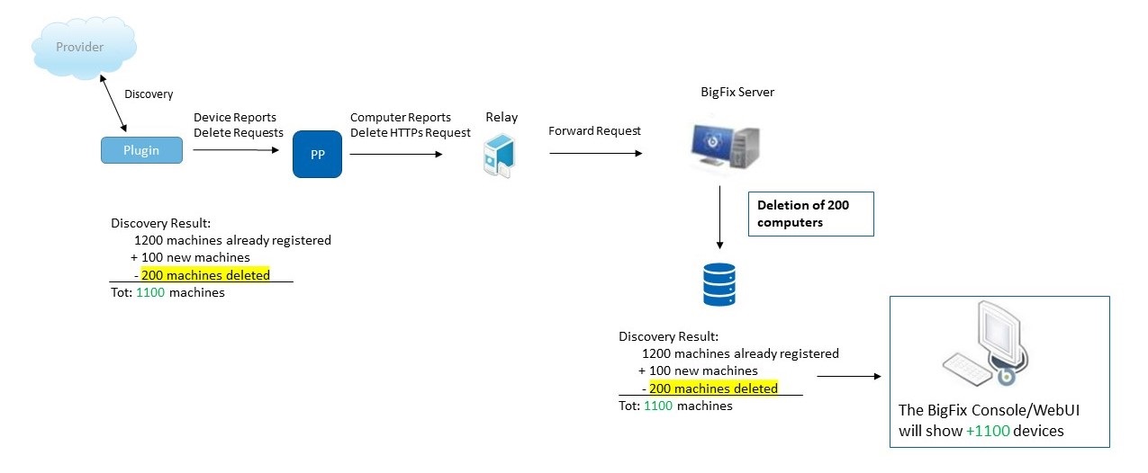 次の例では、プラグインは 100 台の新しいマシンを検出しますが、別の 200 台を検出しないため、プラグイン・ポータルは 100 台の新規マシンの新規レポートと、その他の 200 台のマシンの空のレポートを受け取ります。プラグイン・ポータルでは、新規デバイスを登録し、検出されないデバイスを削除する必要があります (デバイス・アラート/削除要求の矢印)。この新機能により、プラグイン・ポータルは検出されなくなったデバイスに対しても HTTP 削除要求を送信します (HTTP 削除要求矢印)。リレーは BigFix サーバーに要求を転送します。このサーバーは、BigFix データベースから検出されない 200 個のデバイスの物理削除または論理削除 (上記にて紹介し、すでに説明されている新しいプラグイン設定に応じる) のいずれかを実行します。削除されたデバイスは BigFix コンソールと WebUI コンピューター・リストに表示されなくなります。BigFix コンソールと WebUI には、実際に検出されたデバイスのリストが常に表示されます。