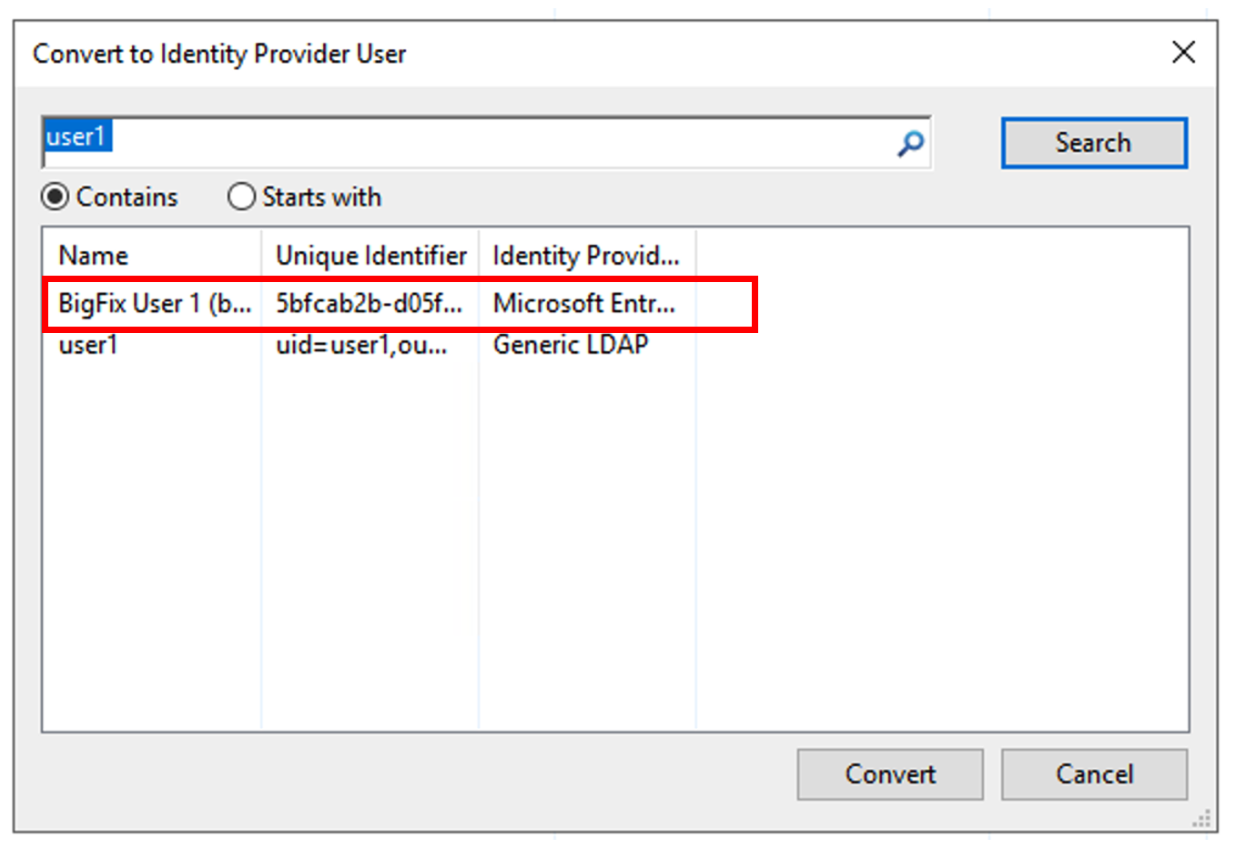 - 「検索」フィールドと 2 つのラジオ・ボタンを使用して、指定された ID プロバイダー・サーバーで定義されているユーザーの照会とフィルタリングを行うことができます。注: 環境内に 1 つ以上の Microsoft ID プロバイダーを設定していて、テナント内に多数のユーザーが存在する場合は、「次で始まる」オプションを使用することを強くお勧めします (「次を含む」オプションよりもはるかに速く処理できるためです)。