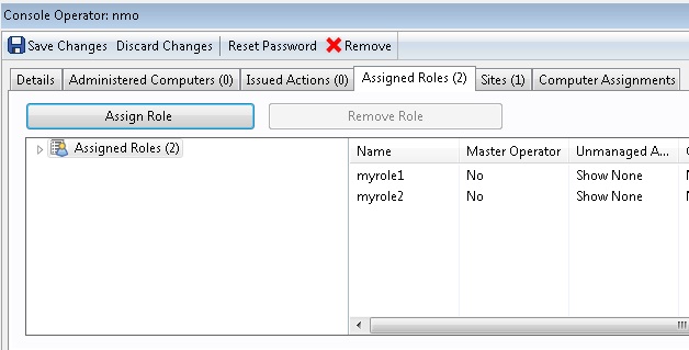 次のスクリーンショットは、NMO に割り当てられた複数の役割 (myrole1 と myrole2) を示しています。