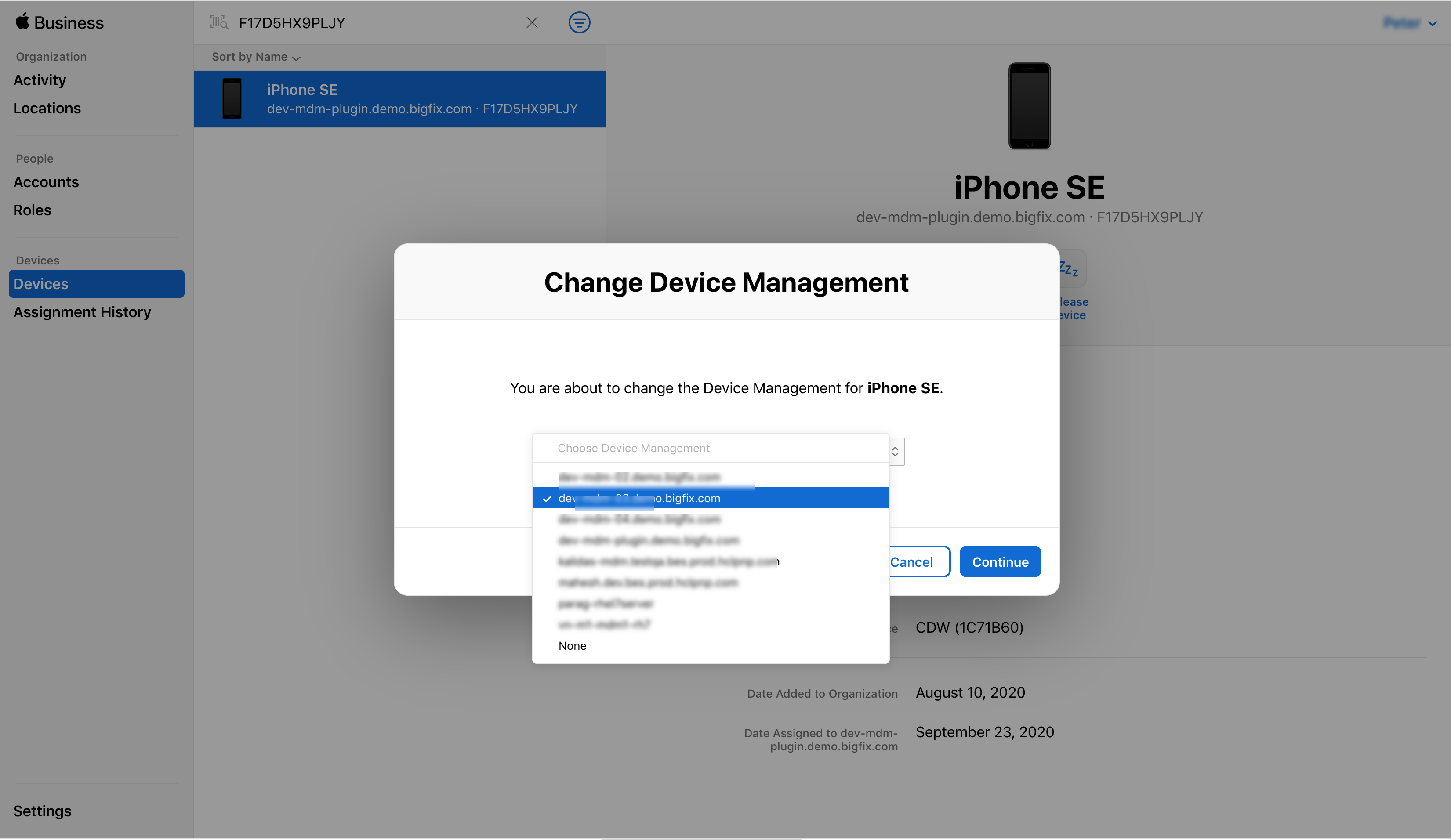 使用可能な MDM サーバーの一覧が表示されます。目的のターゲットを見つけて選択し、「続行」を押します。