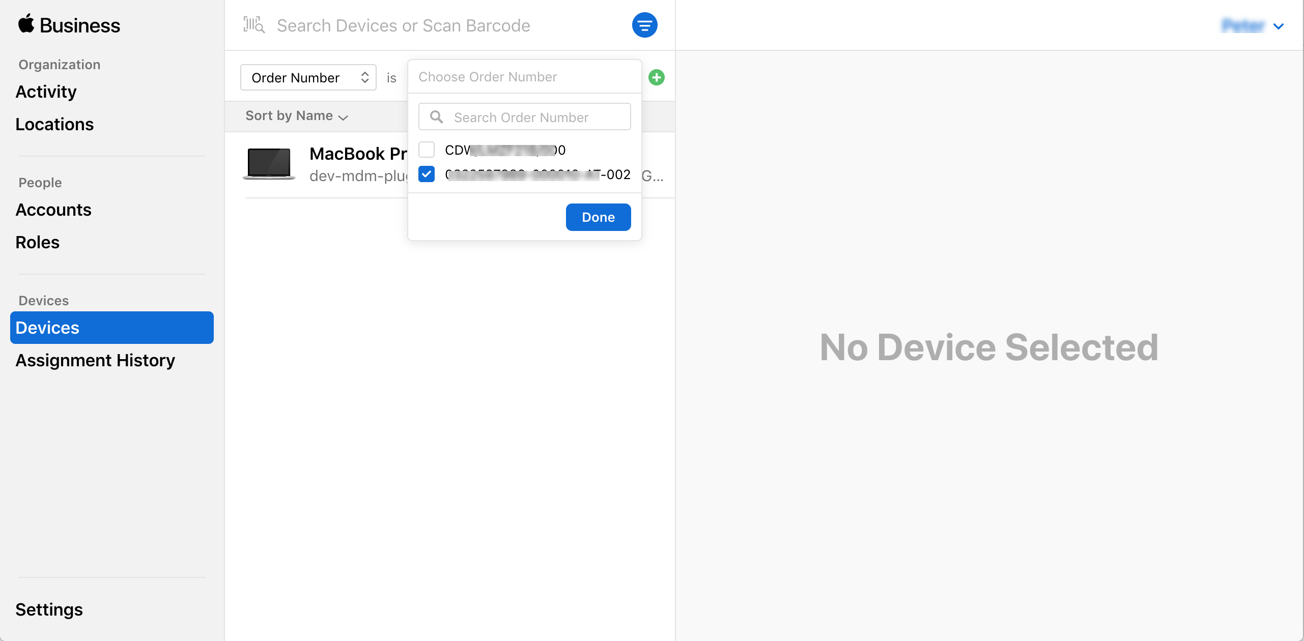 - 注文番号を選択し、「完了」をクリックします。その販売代理店から配送されたすべてのデバイスを見ることができます。