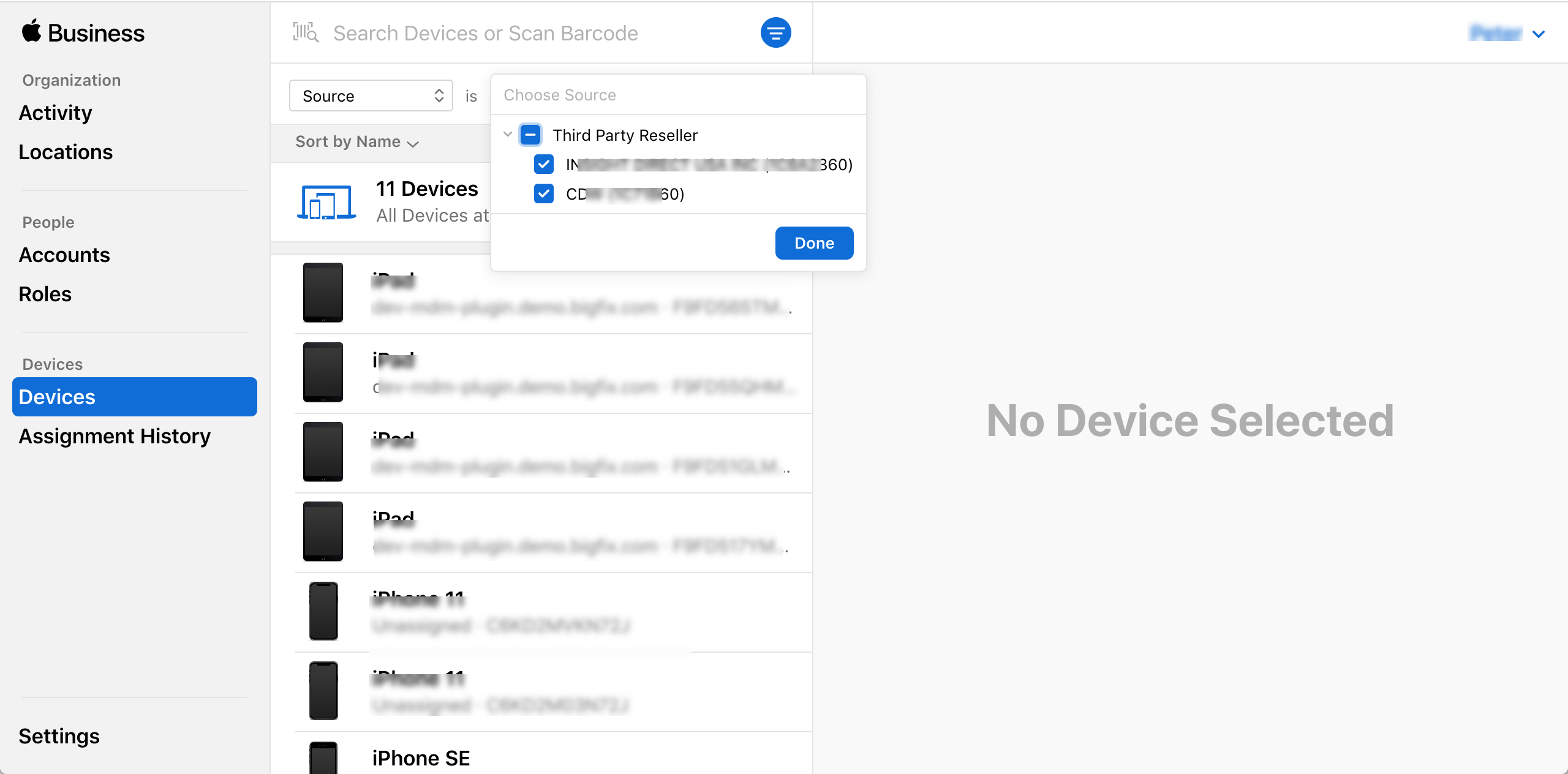 - 販売代理店を選択し、「完了」をクリックします。選択した販販売代理店から取得したすべてのデバイスが表示されます。