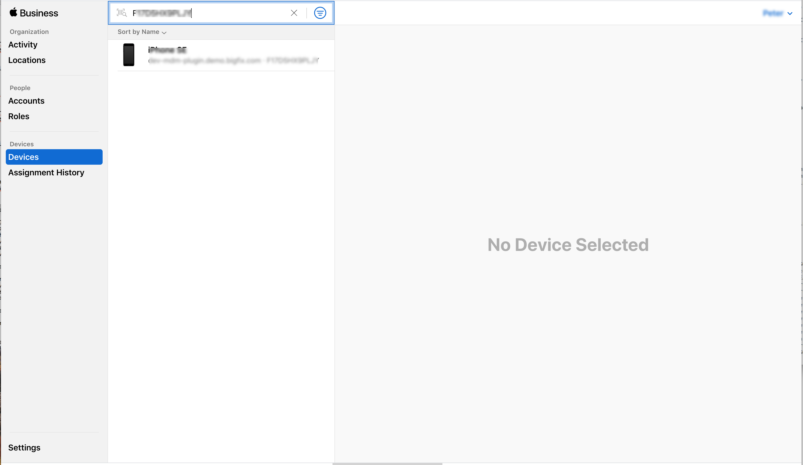 - シリアル番号で検索: 「デバイス」をクリックし、割り当てるデバイスのシリアル番号を入力します。Apple Business Manager が把握している場合は、中央のペインの検索結果に表示されます。