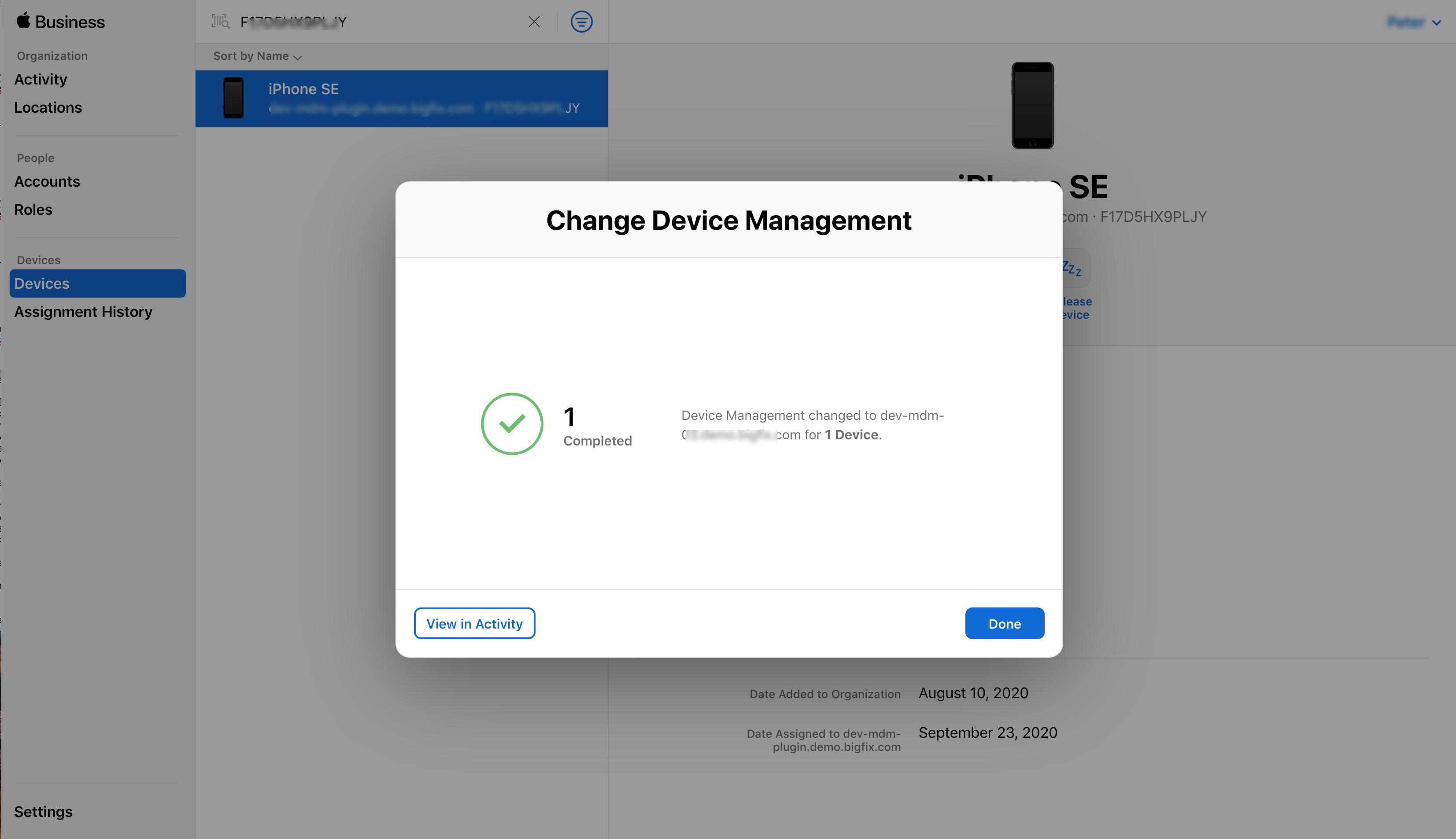 自動デバイス登録を使用することを目的とした各デバイスは、さらに管理する前に、Apple BusinessManager で定義されたサーバーに特別に割り当てる必要があります。これにより、Apple Business Manager が、デバイスが呼び出されたときにどのサーバーを登録に誘導するかを迅速に判断するのに役立ちます。