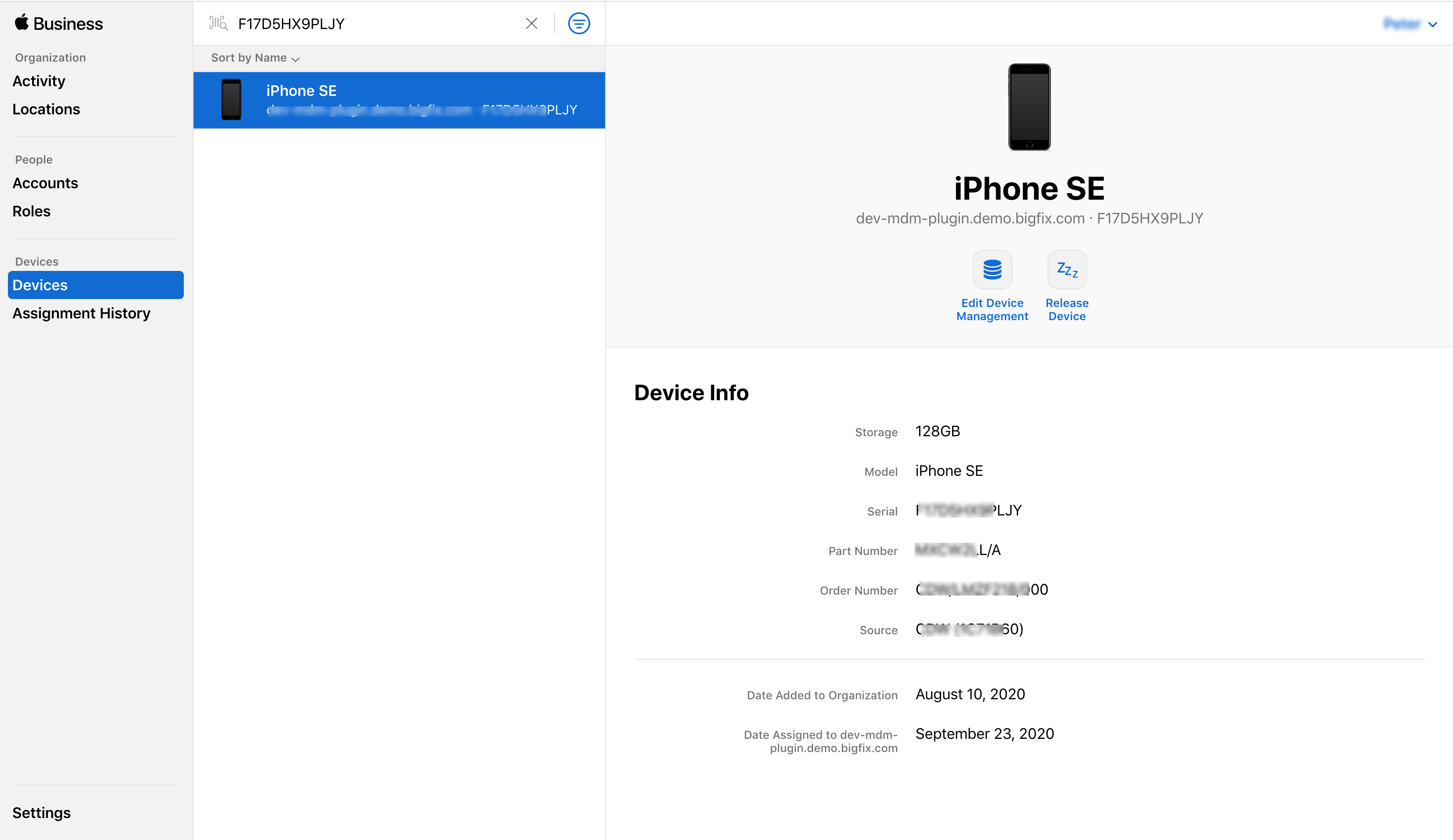 割り当てるデバイスをクリックします。デバイス情報が販売代理店から提供されている場合は、右側のペインにデバイス情報が表示されます。これは、調達プロセスの一部として適切な API を通じて販売代理店から提供されたすべての情報です。「デバイス管理を編集」をクリックします。
