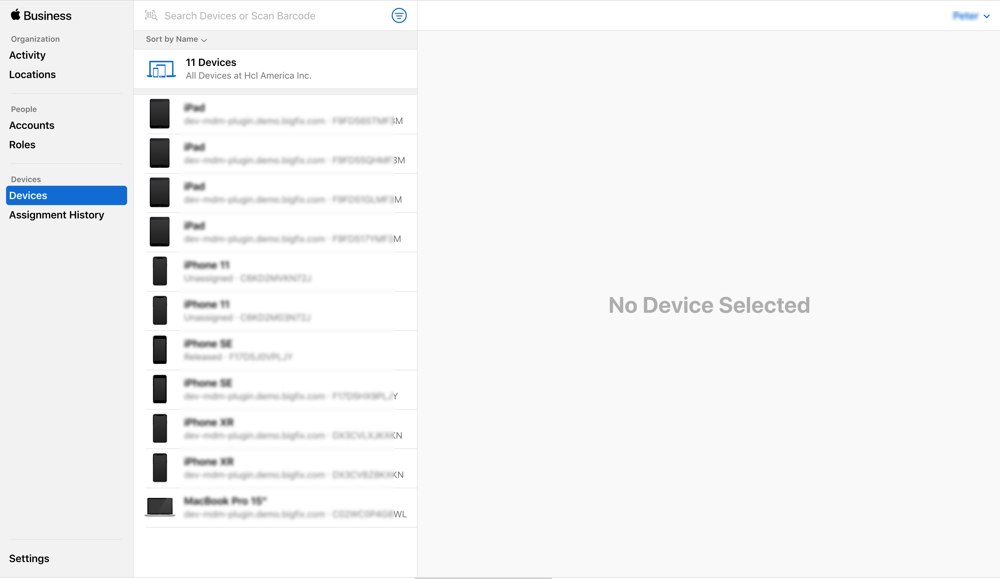 左側のナビゲーションで 「デバイス」 をクリックします。MDM サーバーに既に割り当てられているデバイスの一覧を表示できます。