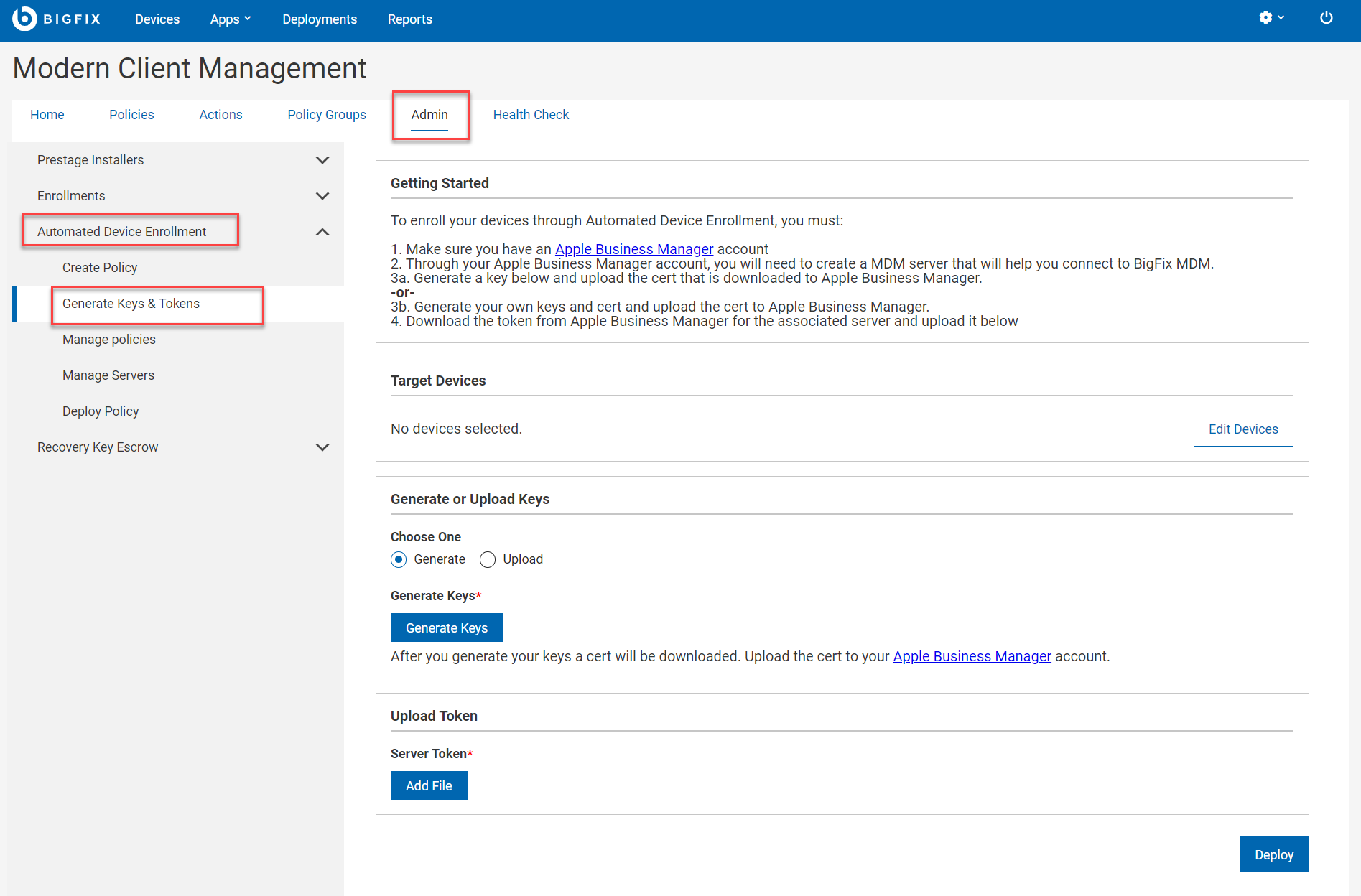 WebUI を介して、自動デバイス登録によって通信を確立し、Apple デバイスを登録するために、Apple Business Manager から取得したサーバー・トークン (.p7m) をアップロードする必要があります。