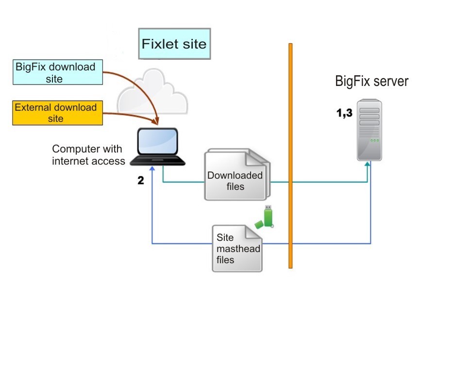 - インターネット側のコンピューターで、各サイト・マストヘッド・ファイルに対して BES Download Cacher ユーティリティーを実行し、サイト・マストヘッド・ファイルが表すサイトから参照されるファイルをダウンロードします。