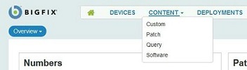 「コンテンツ」->「クエリー」を選択して、WebUI ユーザー・インターフェース上の BigFix Query にアクセスできます。