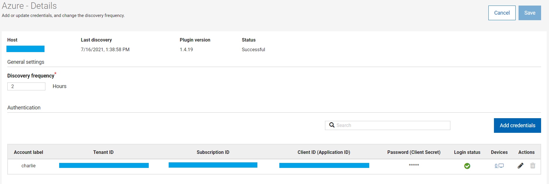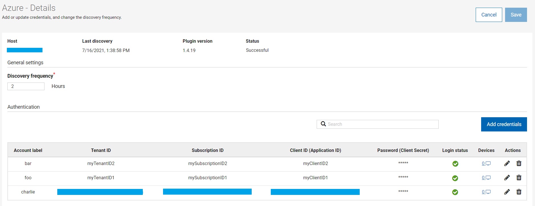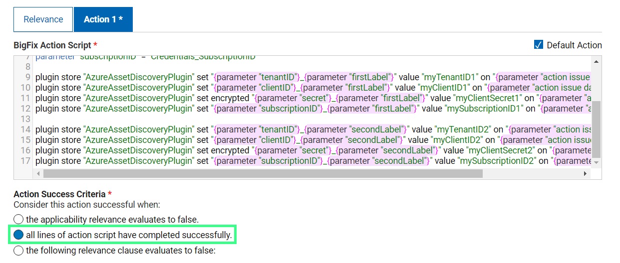 parameter"firstLabel" = "foo" parameter "secondLabel" = "bar" parameter "tenantID" = "Credentials_TenantID" parameter "clientID" = "Credentials_ClientID" parameter "secret" = "Credentials_ClientSecret" parameter "subscriptionID" = "Credentials_SubscriptionID" plugin store "AzureAssetDiscoveryPlugin" set "{parameter "tenantID"}_{parameter "firstLabel"}" value "<myTenantID1>"on"{parameter "action issue date" of action}" plugin store "AzureAssetDiscoveryPlugin" set "{parameter "clientID"}_{parameter "firstLabel"}" value "<myClientID1>"on"{parameter "action issue date" of action}" plugin store "AzureAssetDiscoveryPlugin" set encrypted "{parameter "secret"}_{parameter "firstLabel"}" value "<myClientSecret1>"on"{parameter "action issue date" of action}" plugin store "AzureAssetDiscoveryPlugin" set "{parameter "subscriptionID"}_{parameter "firstLabel"}" value "<mySubscriptionID1>"on"{parameter "action issue date" of action}" plugin store "AzureAssetDiscoveryPlugin" set "{parameter "tenantID"}_{parameter "secondLabel"}" value "<myTenantID2>"on"{parameter "action issue date" of action}" plugin store "AzureAssetDiscoveryPlugin" set "{parameter "clientID"}_{parameter "secondLabel"}" value "<myClientID2>"on"{parameter "action issue date" of action}" plugin store "AzureAssetDiscoveryPlugin" set encrypted "{parameter "secret"}_{parameter "secondLabel"}" value "<myClientSecret2>"on"{parameter "action issue date" of action}" plugin store "AzureAssetDiscoveryPlugin" set "{parameter "subscriptionID"}_{parameter "secondLabel"}" value "<mySubscriptionID2>"on"{parameter "action issue date" of action}"注: foo と bar は、架空のラベルの名前です。ただし、Credentials_TenantID、Credentials_ClientID、Credentials_ClientSecret、Credentials_SubscriptionID は実際の設定名です。これらの 4 つのパラメーターを定義します。これらのパラメーターを組み合わせることにより、上記のようにユーザー・キーとパスワードを設定するために必要なキーを定義できるためです。