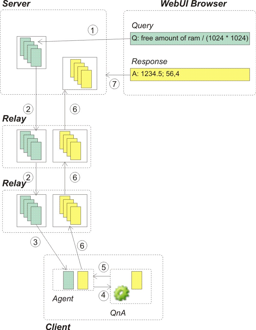 5. エージェントが QnA から応答を受信すると、エージェントはその応答を含むレポートを作成し、他のレポートと同時に親リレーに配信します。