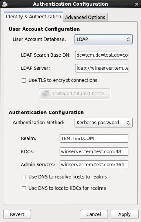 ldap://winserver.tem.test.comのように指定します。 - 「認証方式」で、「Kerberos パスワード」を選択します。