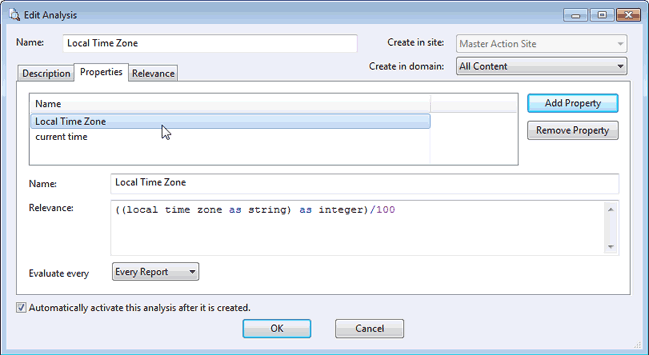 「プロパティーを追加」をクリックするか、既存のプロパティーを選択すると、「関連度」ボックスが編集可能になります。新しいプロパティーを追加する場合は、名前と関連度を入力してプロパティーを定義します。そうでない場合は、既存のテキストを編集します。関連句は、評価されて取得プロパティー値を返します。プロパティーをさらに追加したり、「プロパティーを削除」ボタンをクリックして強調表示されたプロパティーを削除したりできます。