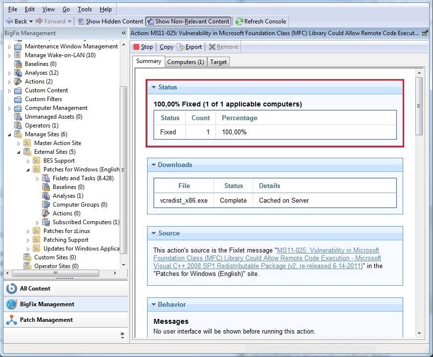 - 脆弱性が除去された後は、クライアントにその Fixlet を再度適用する必要はありません。Fixlet はそのクライアントに関連がないマークが付けられます。