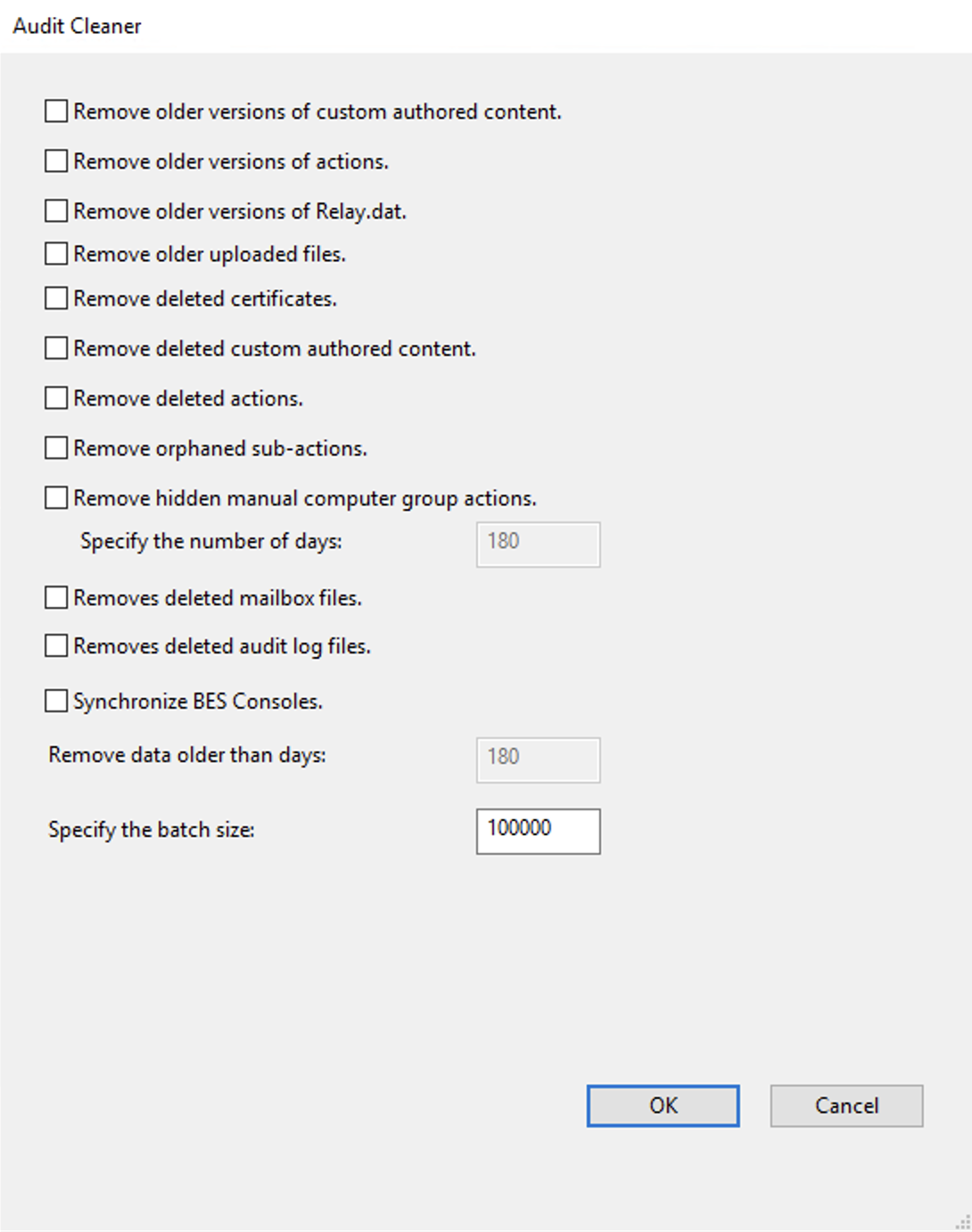 このツールにより、監査証跡として使用される履歴データを BFEnterprise データベースから消去することができます。監査証跡には、削除されたバージョンと古いバージョンの Fixlet、タスク、ベースライン、プロパティー、メールボックス、アクション、および分析が保管されます。