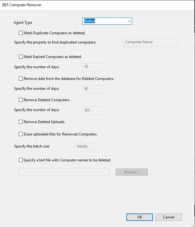 - 特定のコンピューターを削除するには、「削除するコンピューター名が含まれているテキスト・ファイルを指定する」を選択し、改行で区切られたコンピューター名のリストが含まれているテキスト・ファイルの名前を入力します。このオプションはネイティブ・エージェントにのみ適用され、コンピューターの削除操作をスケジュールする場合は使用できません。注: テキスト・ファイルを使用してコンピューター名を削除すると、テキスト・ファイルで "%" 文字がワイルドカードとして使用できるようになり、ツールによって "%" 文字の前に指定したテキスト文字列で始まるすべてのコンピューター名を削除できます。