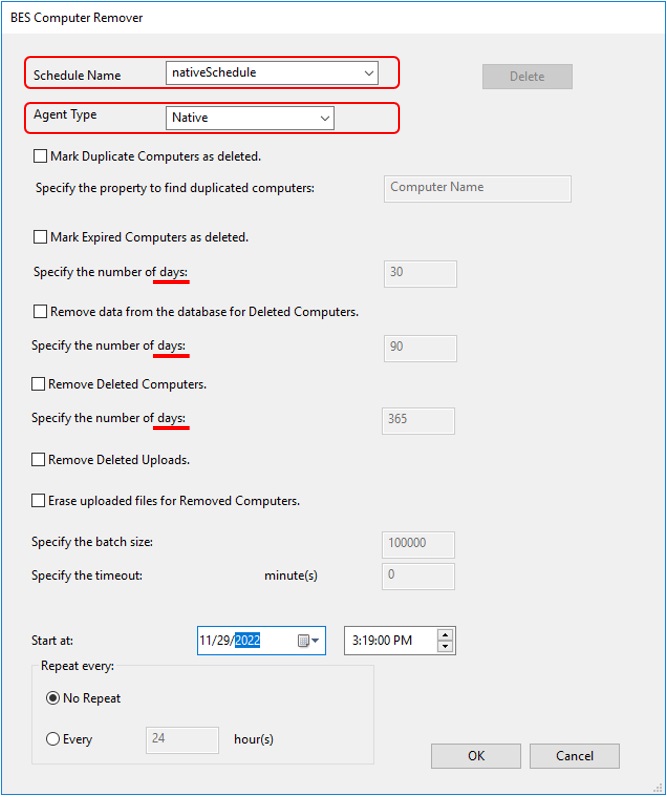 コンピューターの削除開始日時を指定することができます。また、この削除操作を繰り返す間隔を指定することもできます。