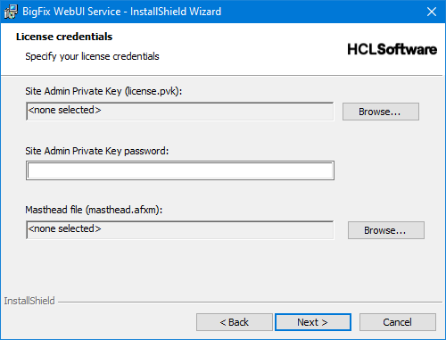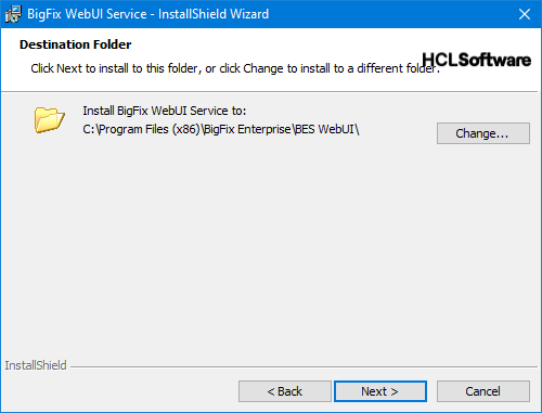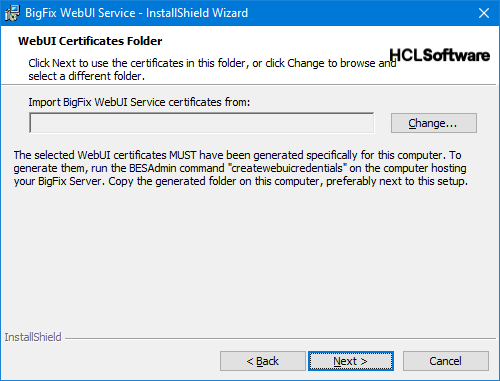 注: WebUI をインストールするコンピューターには、証明書が生成されている必要があります。この証明書を生成するには、BESAdmin.exe /createwebuicredentialsコマンドを実行します。コマンドについて詳しくは、BESAdmin Windows コマンド・ラインを参照してください。 - WebUI インストール・フォルダーがデフォルトのフォルダーとは異なる場合、参照して選択します。