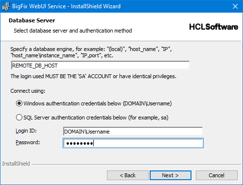 - BigFix データベース・サーバーと、関連する認証方法を指定します。Windows 認証または SQL Server 認証のいずれかを使用してデータベースに接続できます。WebUI が正常に動作するには、sysadmin 権限を持つユーザーを指定する必要があります。