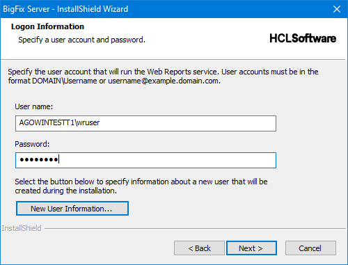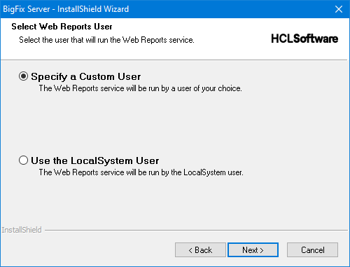 注: 以前のバージョンからアップグレードしている場合、Web レポート・サービス・ユーザーは、アップグレードの前と同じままとなります。 - LocalSystem ユーザーを指定することを選択した場合は、ステップ 7 に進み、インストール・パラメーターを確認します。カスタム・ユーザーを指定することを選択した場合は、以下のダイアログが表示されます。