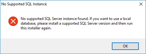 - 「ローカル・データベースを使用」オプションを選択した後、サポートされている SQL Server インスタンスがローカル・コンピューターで見つからない場合、次のエラー・メッセージが表示されます。