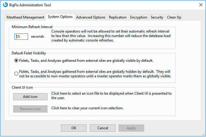 1 番目のオプションで、更新間隔の基準最小値が設定されます。これは、コンソールの「環境設定」ダイアログで指定された、Fixlet リストの更新間隔を示します。デフォルトの間隔は 15 秒ですが、ネットワークの帯域幅に余裕がある場合、この数値を小さくすることで、コンソールの応答性を向上させることができます。反対に、ネットワークに余裕がない場合、この最小値を増やすことが望ましいです。