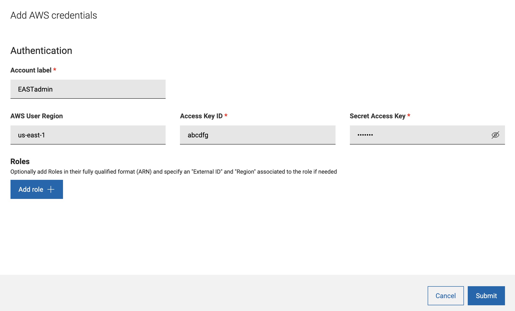 AWS で、プラグインのインストール時または資格情報の追加/編集時に、ユーザーがロールを指定する方法を以下に示します。