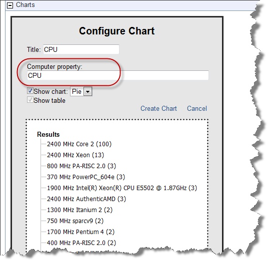 ここでは、プルダウン・メニューを使用して、ネットワーク上の CPU についてのグラフを作成します。タイトルは、選択されたコンピューターのプロパティーを反映して、自動的に入力されます。必要な場合には変更できます。標準的なグラフでは、その下にテーブルが表示されます。チェック・ボックスを使用して、グラフ、テーブル、またはその両方のどれを表示するかを指定します。