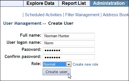 このページは、「管理者」 > 「ユーザーの管理」 > 「ユーザーの作成」から使用できます。名前、ログイン、パスワードの入力およびユーザー役割の定義を求められます。