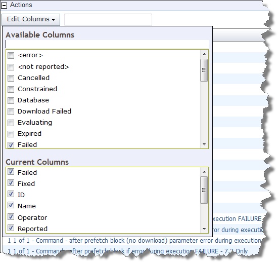 これは「アクション」レポートの例であるため、すべてのヘッダーは、「アクション」データベース内のフィールドを参照しています。「使用可能な列」ボックス内の項目にチェック・マークを付けると、その項目が「現在の列」ボックスに追加されます。項目をクリアすると、両方のボックス内でクリアされます。通常、「現在の列」ボックスのリストの方が短く、ここで列のレイアウトを一目で確認できるため、「使用可能な列」の長いリストをスクロールしなくても済みます。