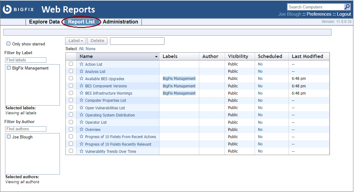 プログラムの「データの検索」セクションを使用すると、BigFix ネットワーク全体から収集したデータを表示し、データをフィルタリングし、レポートを作成できます。