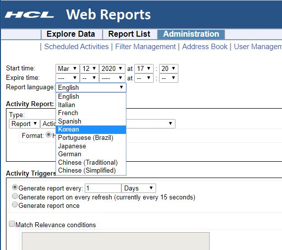 - 「アクティビティー・レポート」セクションでは、スケジュールするレポートおよびそのフォーマットを選択します。プルダウン・メニューから、必要なレポートを選択します。