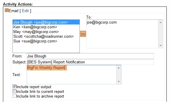通常、オプションは、レポートの電子メールでの送信のみです。これを行うには、「電子メール」チェック・ボックスをクリックし、アドレス帳から連絡先を追加し、電子メールで送信するレポートの件名行を設定します。