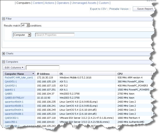 この重要なレポートを 1 回クリックするだけで表示できます。上部にあるリンクを使用して、Fixlet の「コンテンツ」、「アクション」、「オペレーター」などの他のデータ・セットを検索できます。