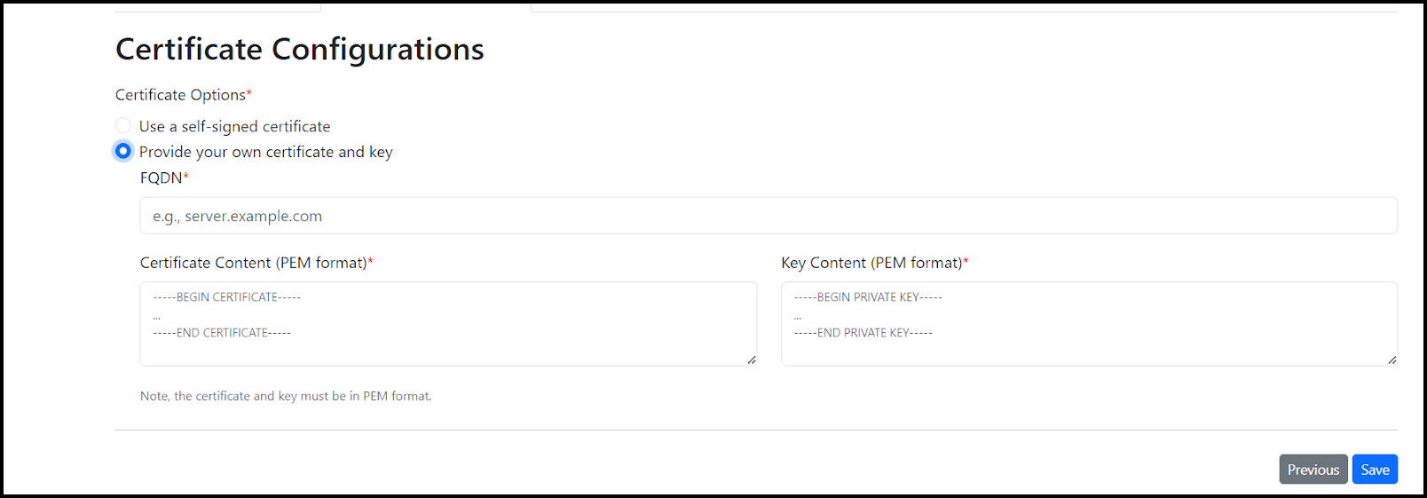 次のスクリーンショットは、2 番目のオプションを示しています。独自の証明書とキーを入力します。ここで、証明書と主要な内容は PEM 形式で指定する必要があります。