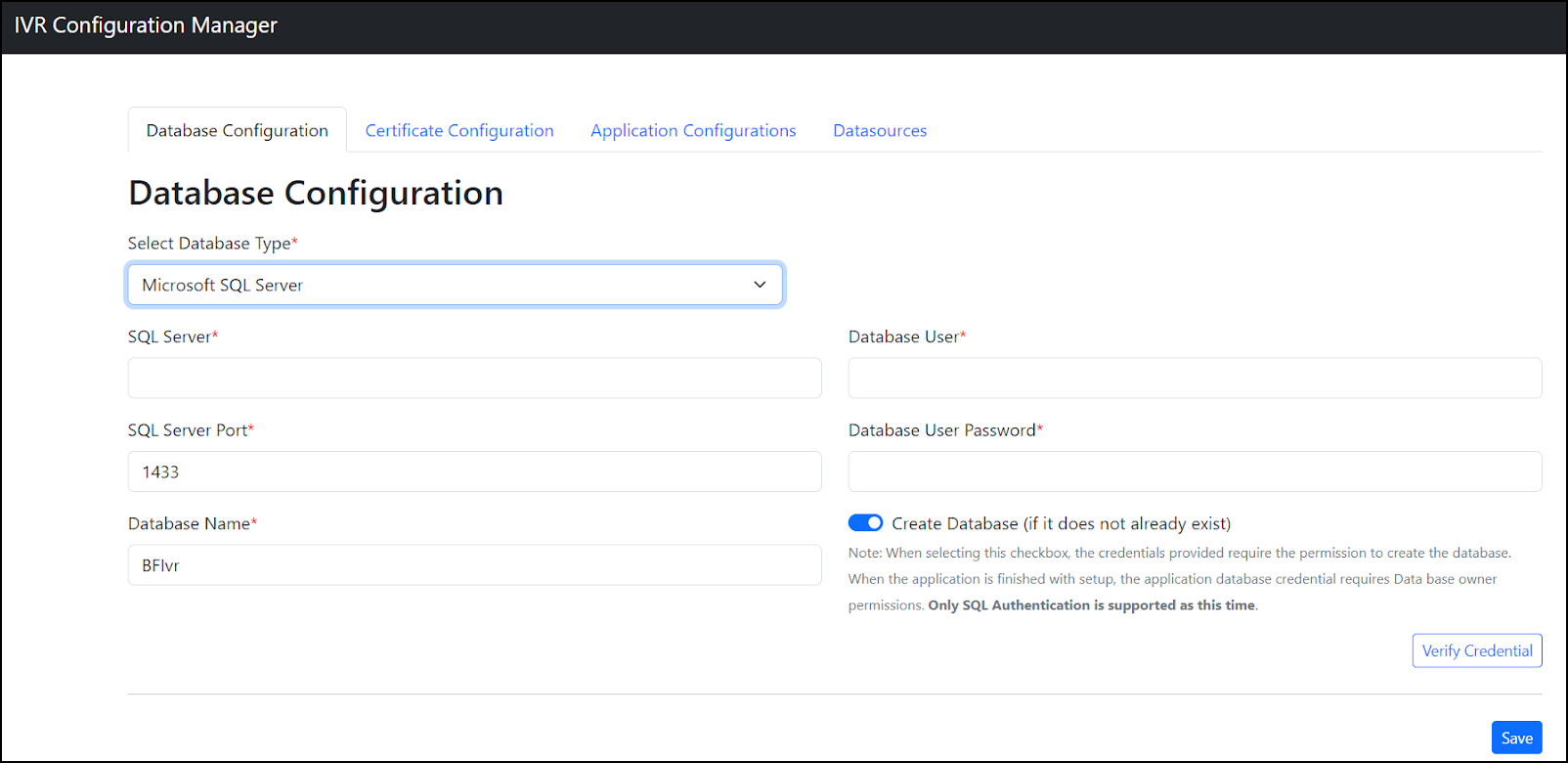 資格情報を確認したら、「保存」をクリックしてデータベース構成を保存します。