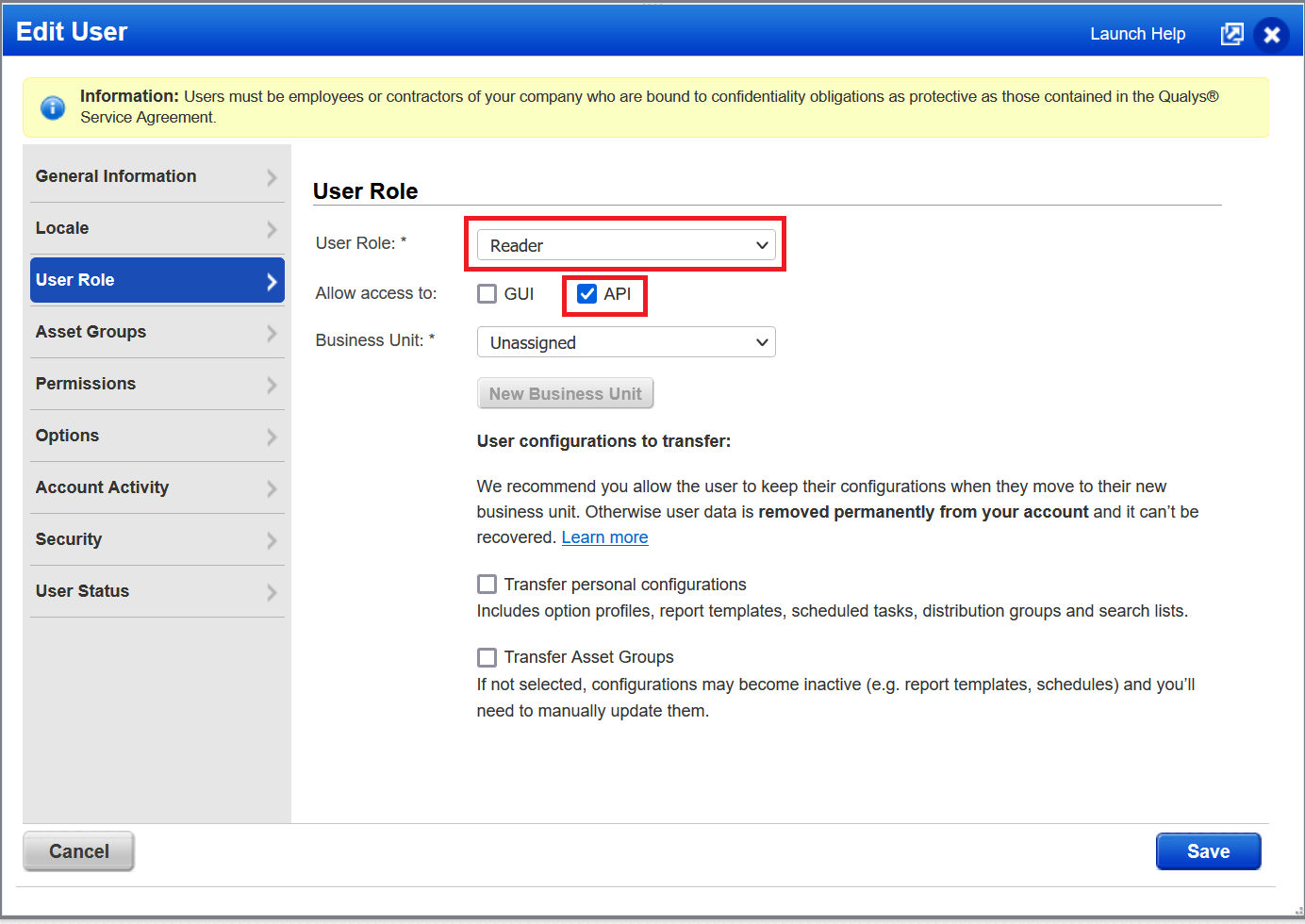 「ユーザー・ロール」タブで、ユーザー・ロールに「読者」を選択し、「API へのアクセスを許可」を選択します。
