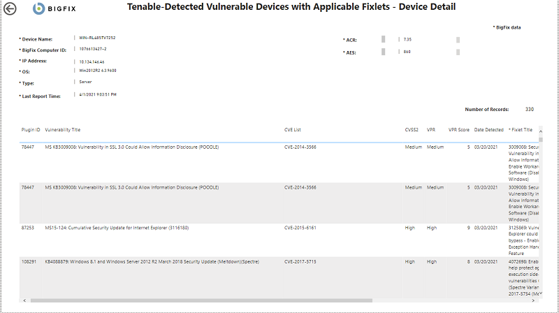 BigFix Insights for Vulnerability Remediation で、Tenable.io の脆弱性データを利用できます。Tenable Lumin が使用可能な場合、BigFix Insights for Vulnerability Remediation は、次の資産の優先順位付けデータも利用します。