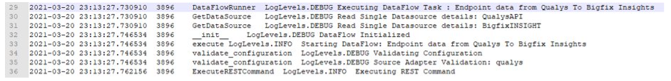 Table 1. DataFlow ログの詳細 メッセージ 説明 Executing DataFlow Task: Endpoint data from Qualys to BigFix Insights データ・フローの開始を示します。 Loading Qualys Data Qualys データのロードを示します。 Loading Insights Data Insights データのロードを示します。 RecordCaches Loaded In