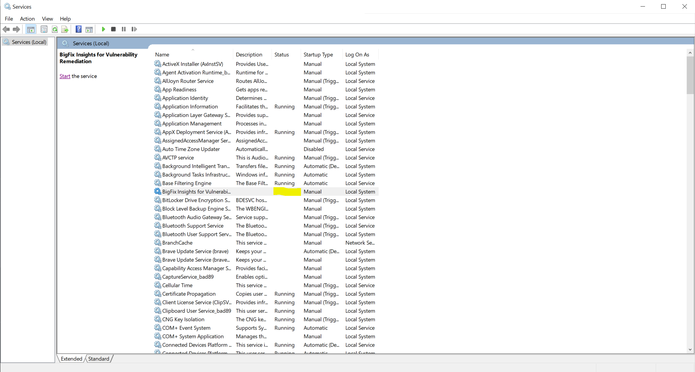 - サービス状態の Windows サービス・マネージャーを確認します。サービスは実行中の状態である必要があります。