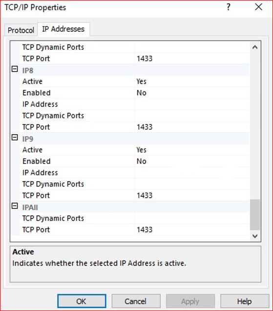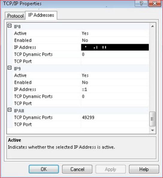 上のスクリーンショットでは、インスタンスはポート番号 1433 で listen しています。SQL Server が動的ポートで構成されている場合は、現在のポート番号が「TCP 動的ポート」テキスト・ボックスに表示されます。上のスクリーンショットでは、インスタンスはポート番号 49299 で listen しています。