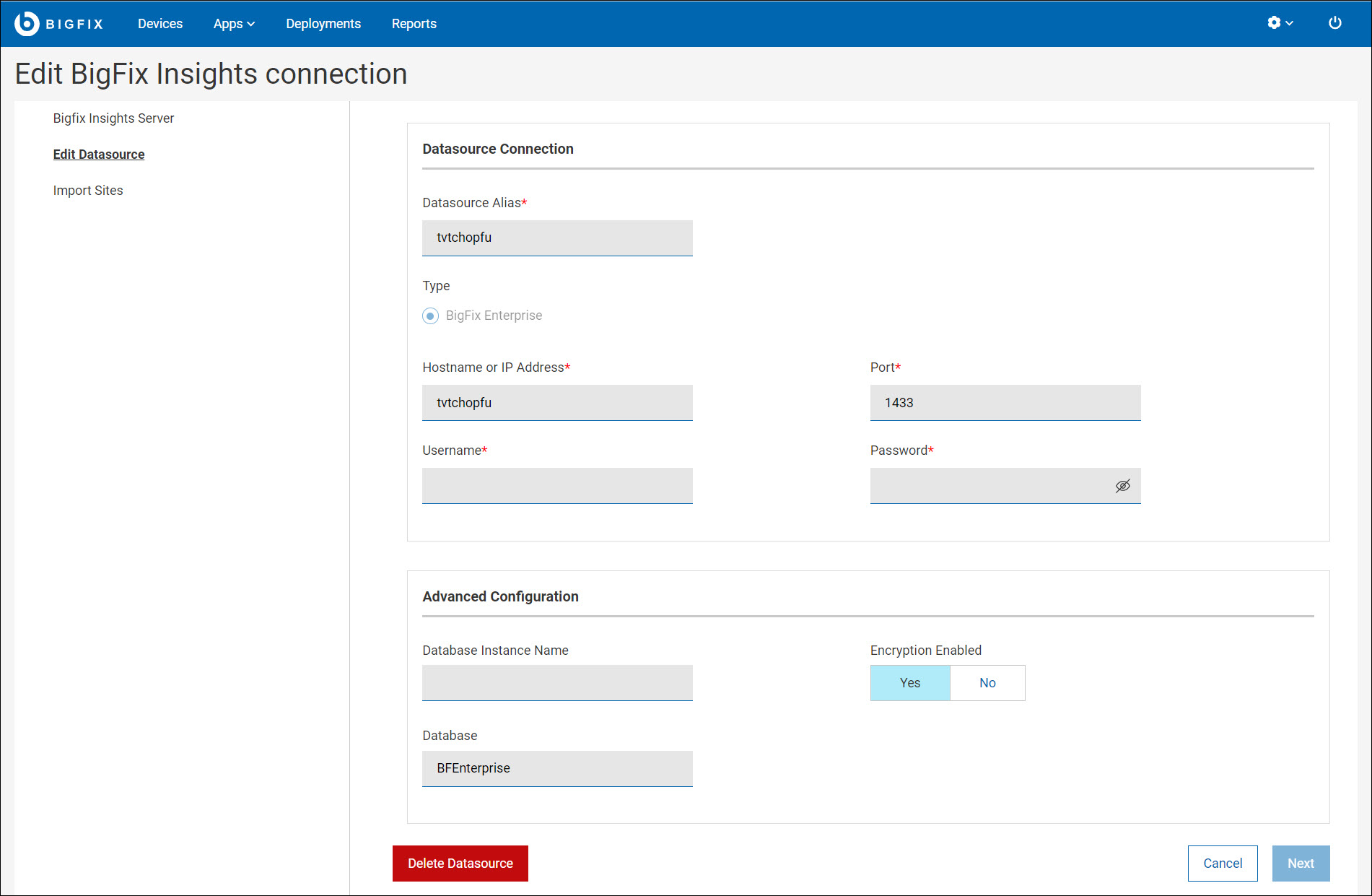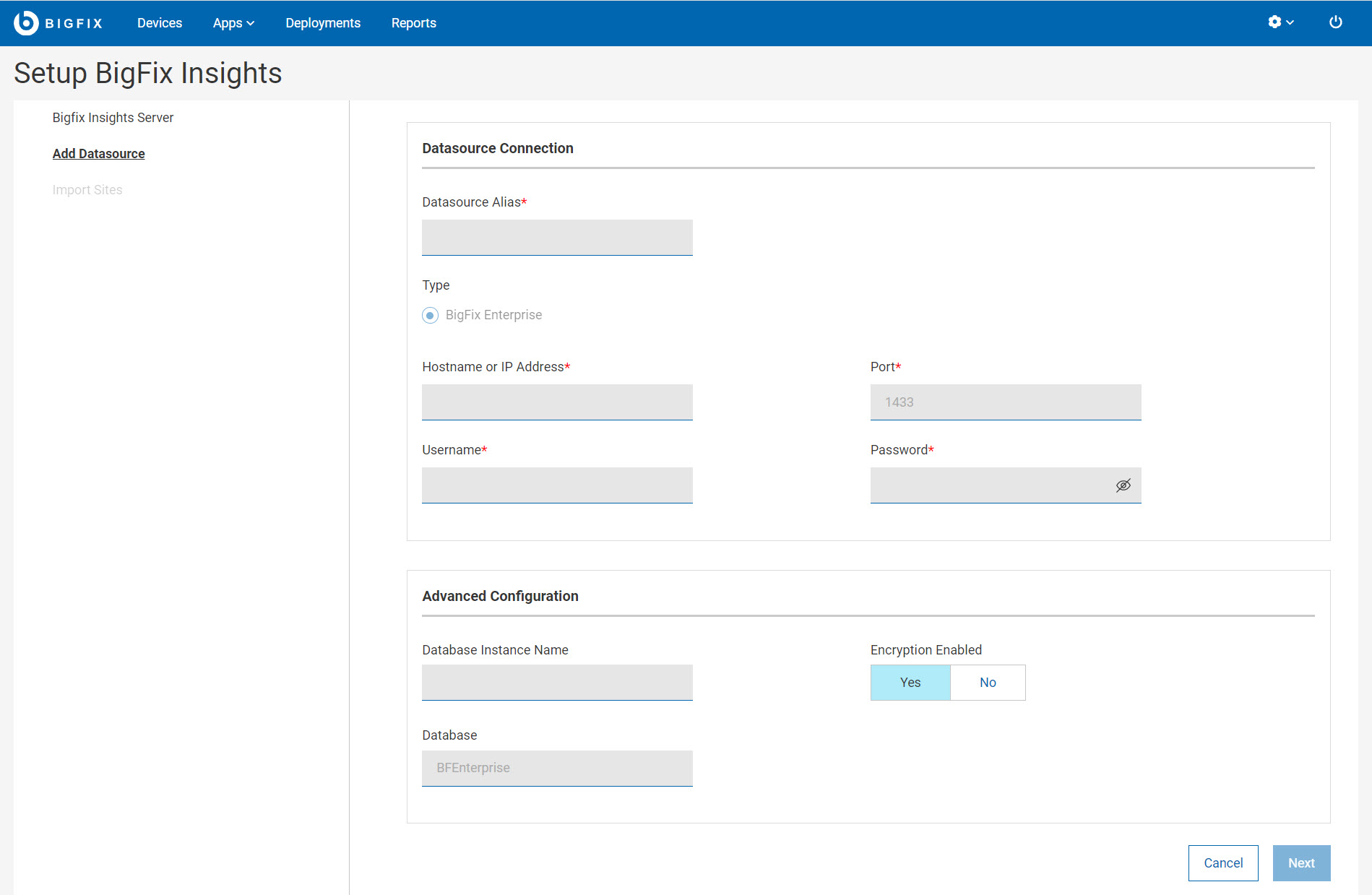「データ・ソースの追加」をクリックします「データ・ソース接続」と「詳細な構成」の詳細が表示された、次のような「BigFix Insights の設定」ページが表示されます。